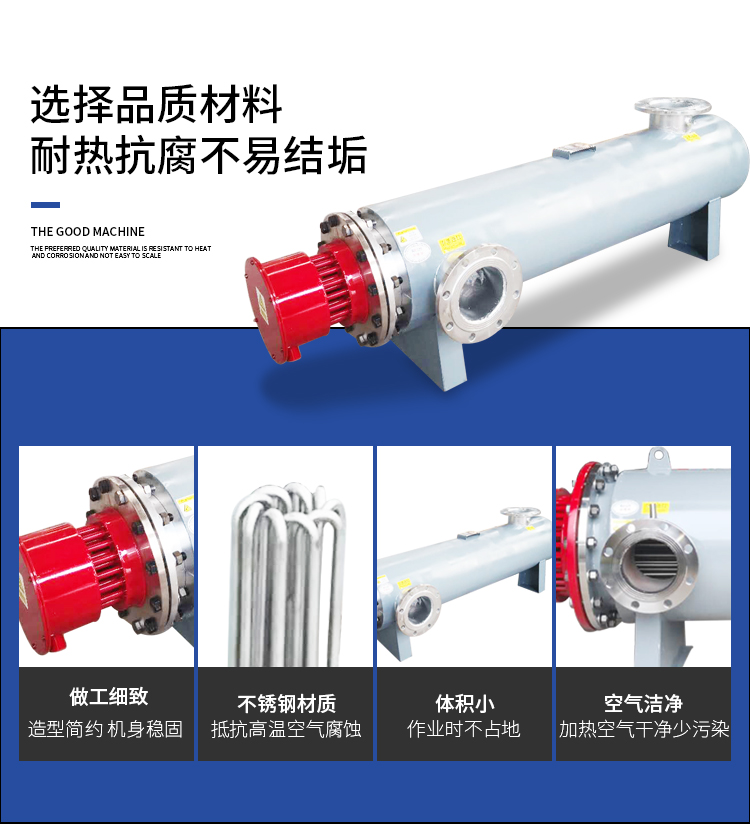 1、管道加熱器采用了不銹鋼筒體,體積小、占地少、移動(dòng)方便,具有較強(qiáng)的抗腐蝕能力,在不銹鋼內(nèi)膽和不銹鋼外殼之間采用了加厚保溫層,失溫程度低,保持溫度,節(jié)省電能。