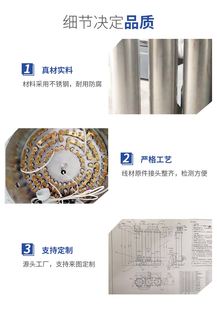 2、立式、臥式管道加熱器材質(zhì)有:碳鋼、不銹鋼SUS304、不銹鋼SUS316L、不銹鋼310S等。根據(jù)加熱不同的工藝要求選用合適的材料。